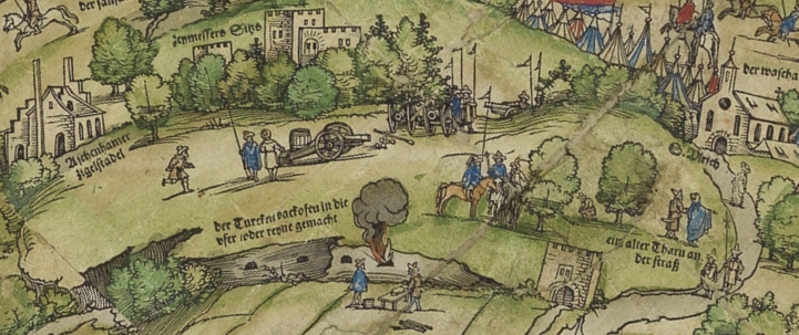 Bild: Niklas (Niclaus) Meldemann (Verleger), Hans Sebald Beham (Holzschneider), “Der stadt Wien belegerung, wie die auff dem hohen sant seffansthurn allenthalben gerings um die gantze stadt, zu wasser vnd landt mit allen dingen anzusehen gswest ist […]”, 1530, Wien Museum Inv.-Nr. 48068, CC0 (https://sammlung.wienmuseum.at/objekt/125187/)