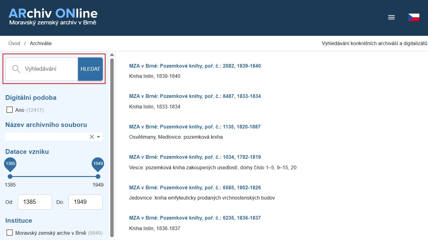 Direkt in digitalisierten Quellen kann man auf der Web-Plattform ARON (Archiv Online – Moravský zemský archiv v Brně) recherchieren: https://www.mza.cz/aron/