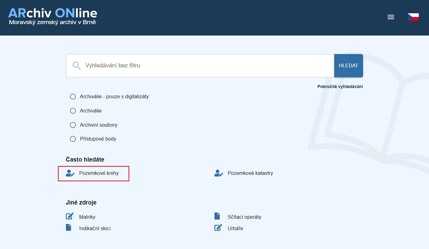 Die Seite wird in Tschechisch und Englisch angeboten. Bei der Erklärung anhand einer beispielhaften Recherche gehe ich vor allem auf die tschechische Variante ein, da die Übersetzung (noch) nicht durchgängig ist. Um zu den grundherrschaftlichen Beständen zu gelangen, muss man direkt auf der Startseite auf Pozemkové knihy (Grundbücher) klicken.