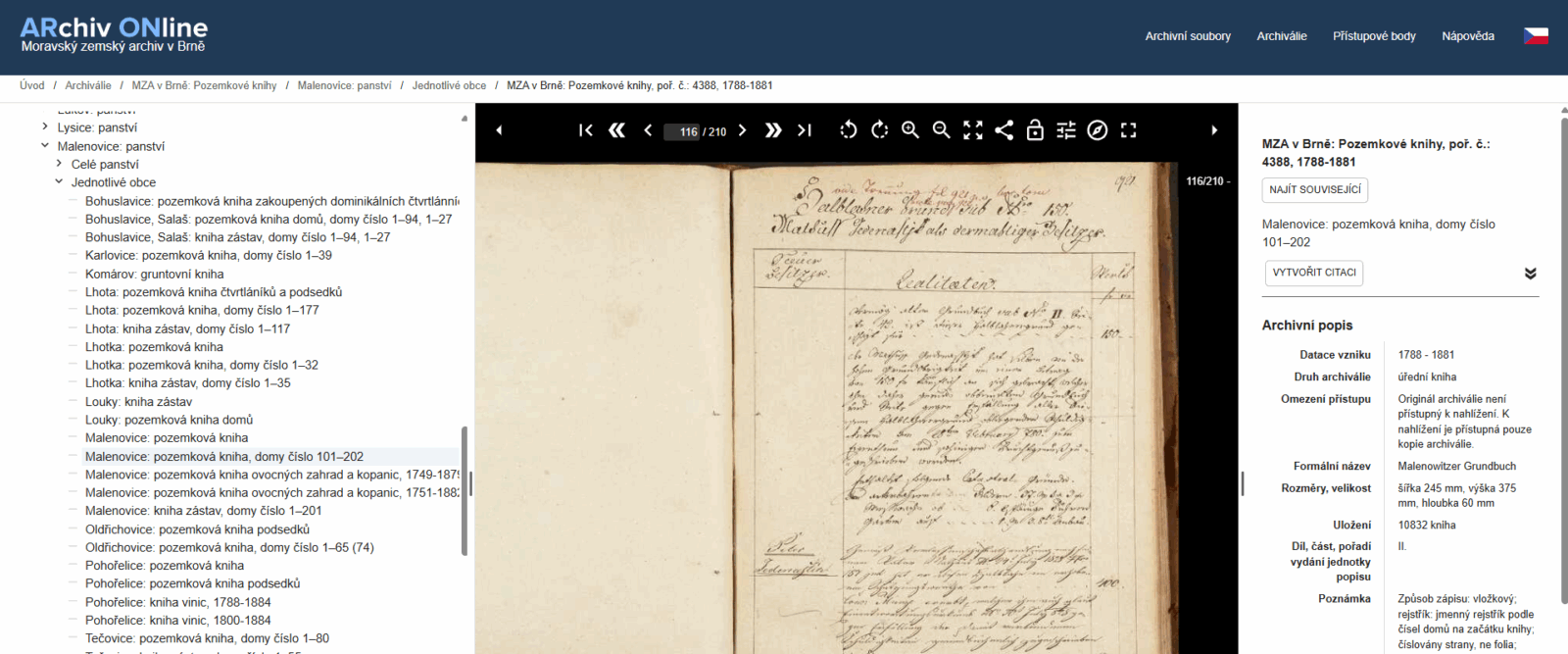 Bei der Suche nach dem Grundbuch zum Haus mit der Hausnummer 150 in Malenovice, ruft man den Bestand Jednotlivé obce (einzelne Gemeinden) auf. Anschließend ist es notwendig, sich eine Übersicht über die verfügbaren Bestände zu verschaffen. Hier beziehen sich zumindest fünf der Bücher direkt auf Malenovice. Interessant könnte das Digitalisat mit der Bezeichnung Malenovice: pozemková kniha, domy číslo 101–202 (Malenovice: Grundbuch, Hausnummern 101–202) sein. Tatsächlich findet man Eintrag zur gesuchten Hausnummer auf dem Blatt 921.