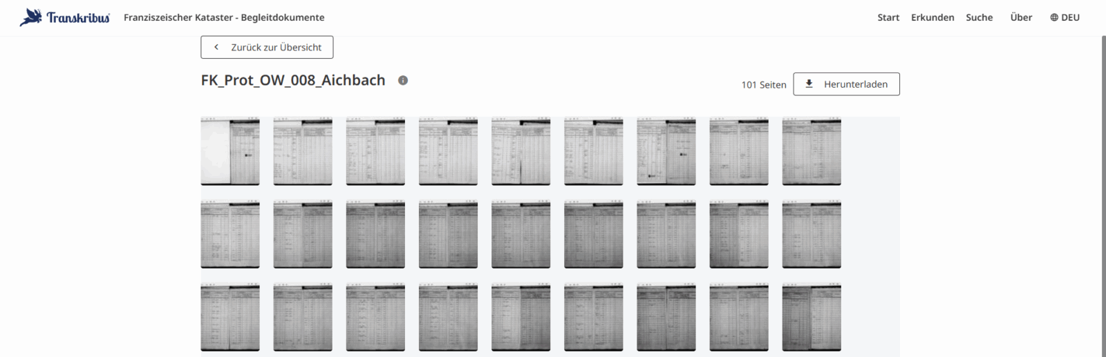 Bei einem Klick auf ein Dokument, gelangt man zum Digitalisat. Zunächst wird eine Übersicht der Einzelseiten angezeigt. Rechts oben besteht zudem die Möglichkeit zum Herunterladen des gesamten Dokuments. Dazu muss man eine Mail-Adresse angeben und erhält anschließend einen Link zugesendet.
