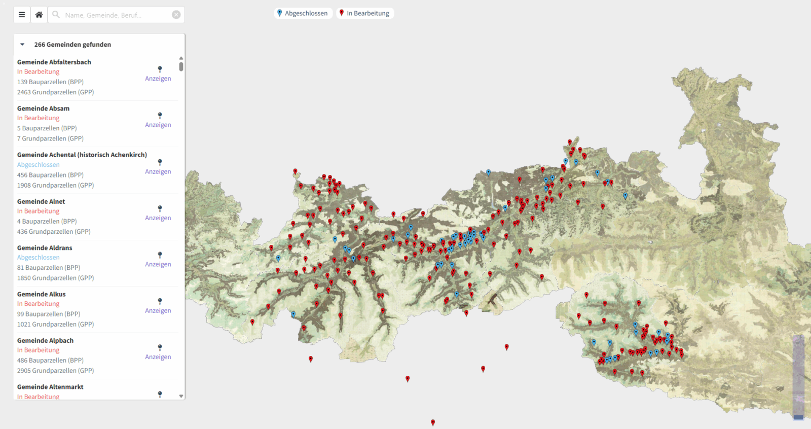 Erste Ergebnisse dieser Arbeiten sind auf der Dashboard-Testseite zur GIS-Lösung Kati einsehbar. Als Grundkarte dienen die georeferenzierten Mappen zum Kataster. Aktuell sind sie für die Bundesländer Kärnten, Salzburg, Tirol und Vorarlberg verfügbar. Anhand von blauen (abgeschlossen) und roten (in Bearbeitung) Markern ist hier der Bearbeitungsstatus von 266 Katastralgemeinden Tirols ersichtlich. Beim Zoomen auf eine Gemeinde werden die bereits erfassten Grundparzellen anhand von Markern sichtbar. Zu jeder Parzelle sind in weiterer Folge die Besitzer:innen, wenn vorhanden, ein Vulgo-Name, die fortlaufende Nummer der Grundparzelle, die Fläche in Quadratmeter, die Katastralgemeinde und die Kulturgattung hinterlegt. Anhand einiger dieser Informationen, kann über eine Suchfunktion gefiltert werden.