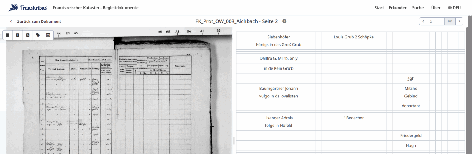 Eine weitere Seite, die passenderweise den Namen Franzi trägt, beschäftigt sich mit den Begleitdokumenten zum Franziszeischen Kataster in Österreich. Direkt auf der Startseite wird eine Volltextsuche für alle bereits bearbeiteten Dokumente angeboten, basierend auf einer Transkription per Künstlicher Intelligenz (KI) durch Transkribus. Die Ergebnisse sind jedoch noch sehr fehlerhaft und benötigen menschliche Überarbeitung. So entstand auch das Citizen-Science Projekt. Dennoch liefert die Suchfunktion bereits hilfreiche Ergebnisse. Da die KI laufend lernt, wird sie zukünftig auch noch exakter Lesen können.