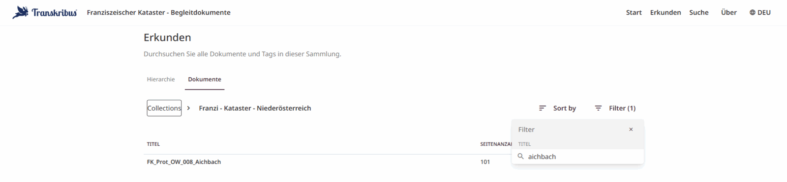 Gefiltert werden können diese Bestände unter dem Reiter „Dokumente“ nach der Auswahl einer Bestandsgruppe. Dazu gibt es die beiden Optionen „Sort by“ und „Filter“.