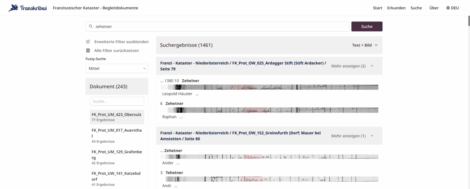 Es ist möglich beispielsweise nach einem Familiennamen zu suchen. Über das Auswahlfeld „Fuzzy-Suche“ kann gesteuert werden, ob auch ähnliche Schreibweisen gefunden werden sollen. Links kann zudem nach Dokumenten gefiltert werden. Im rechten Bereich werden die einzelnen Suchergebnisse als Bild und Text angezeigt.