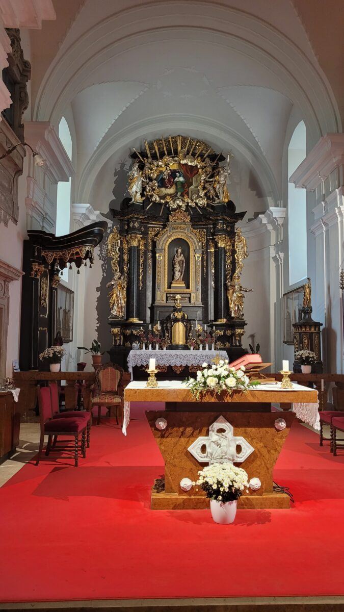 Kirche in Hajosch mit der gotischen Muttergottesstatue, die noch aus Bussen hieher gebracht worden war.