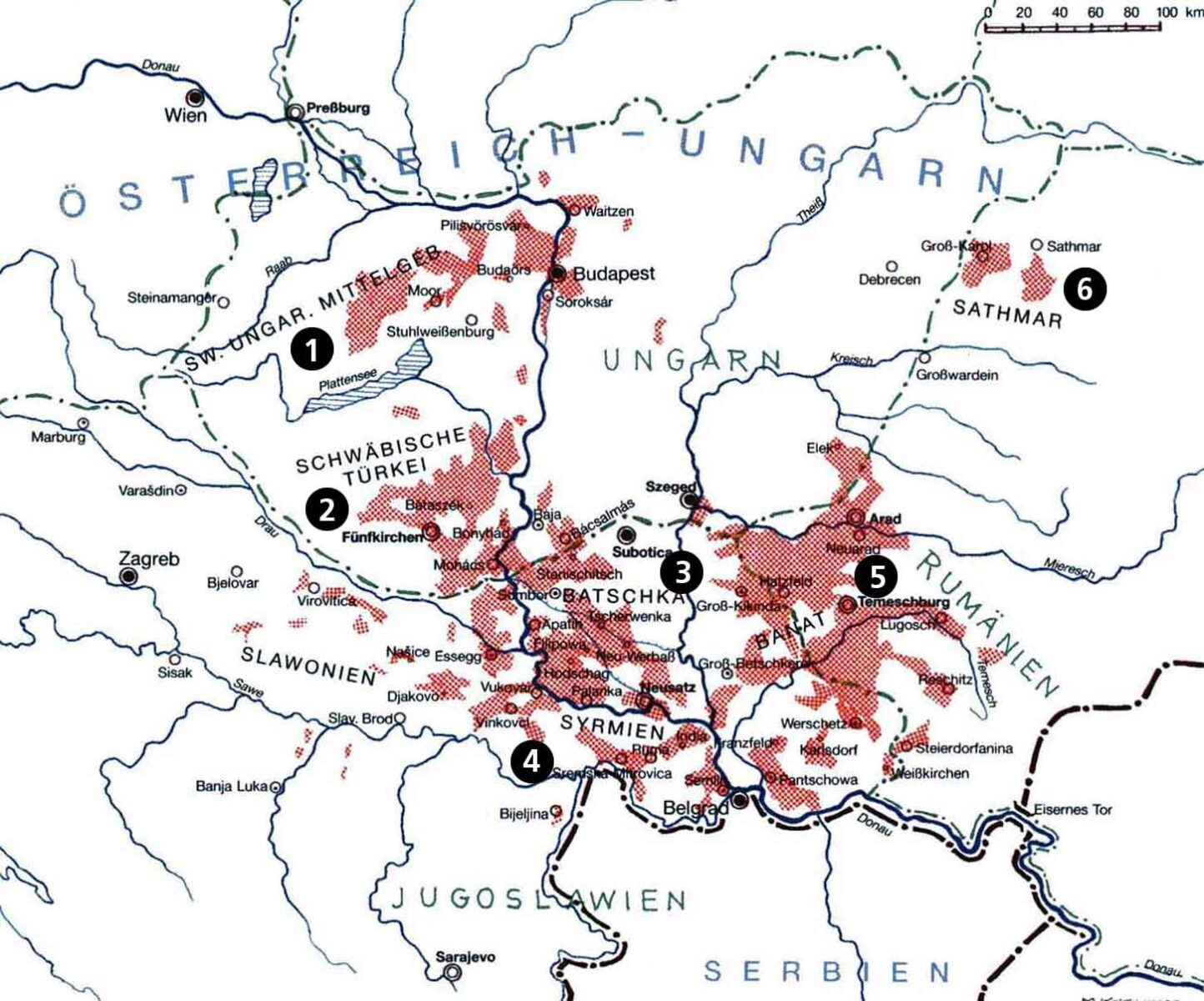 Bevölkerungsgruppen: 1+2 Ungarndeutsche, 3-5 Banater Schwaben und Kroatiendeutsche, 6 Sathmarer Schwaben St. Gerhards-Werk Stuttgart, Donasuschwaben im Karpatenbecken, als gemeinfrei gekennzeichnet, Details auf Wikimedia Commons