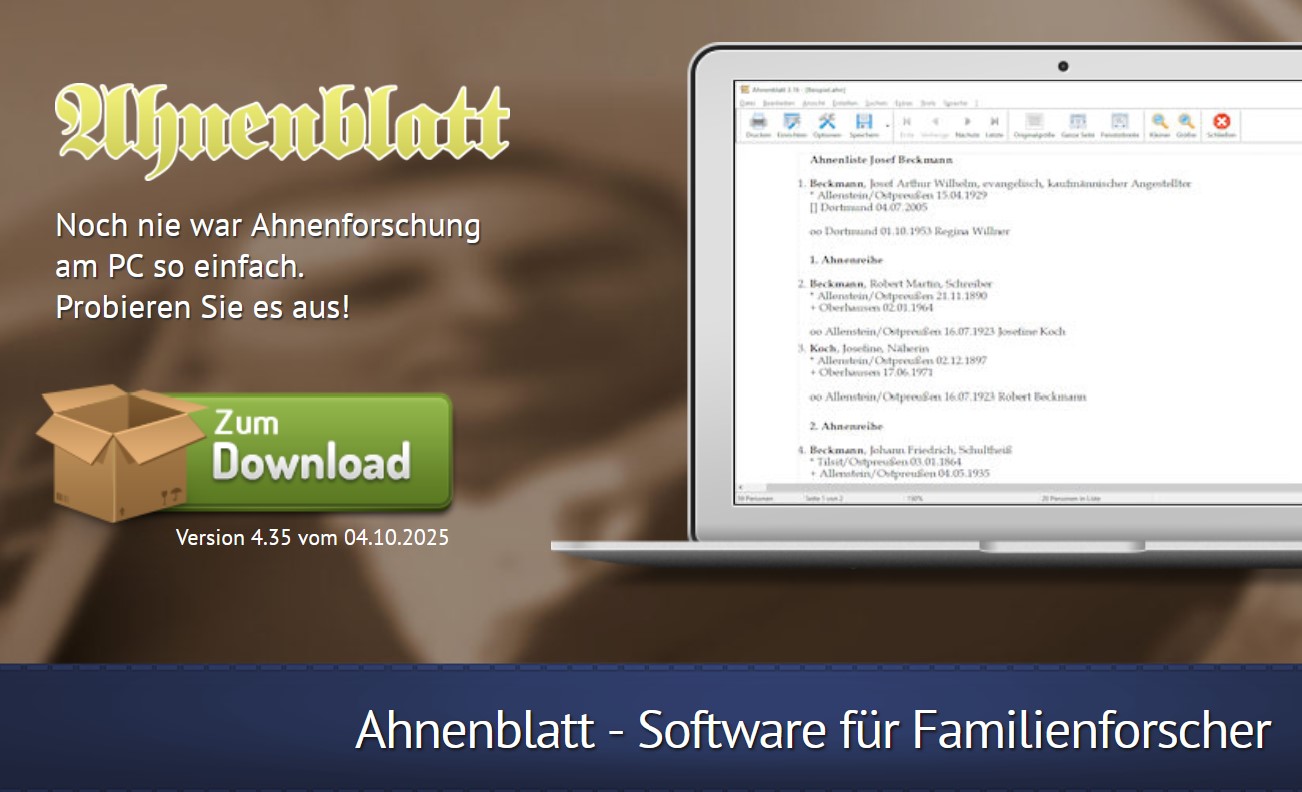 ZoomMittwoch, 03.12.2025, 19:00 Uhr online über Zoom mit Dirk Böttcher, Ahnenblatt Ahnenblatt ist eine Windows-Software für Familienforscher zur Organisation, Verwaltung und Ausgabe der eigenen Familiendaten – entwickelt in Deutschland seit 2001. Ahnenblatt unterstützt bei der Eingabe der Daten u.a. mit einer Plausibilitätsprüfung. Dabei sind der Dateneingabe keine Grenzen gesetzt. Geben…